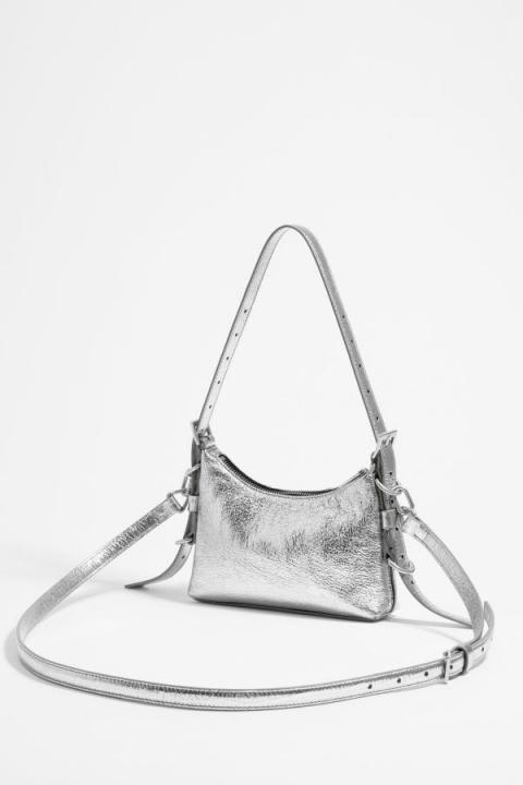 Bolso hobo Pocket de piel metalizada en color plata. Modelo de tamaño mini, cierre de cremallera y doble asa ajustable, de hombro y bandolera de piel. Exterior personalizado con logo metálico. Este modelo contiene 100% Poliéster reciclado.