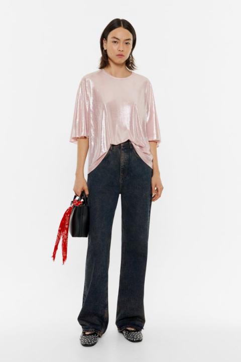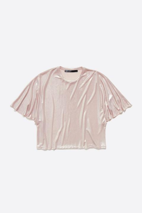 Camiseta de tejido metalizado en color rosa. Modelo de corte boxy, con escote caja y manga corta murciélago con vuelo.
