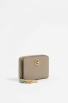 Cartera de piel con solapa en color gris claro. Modelo con cierre de cremallera y a presión, tirador con cabo y tarjetero interior. Exterior personalizado con logo metálico.