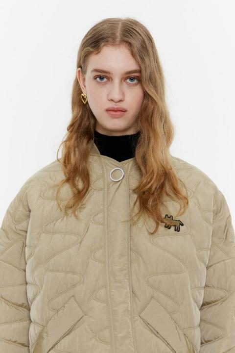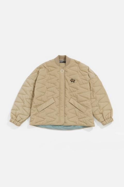 Cazadora corta de tejido técnico en color caqui claro. Modelo de corte línea A, cuello subido de punto, manga larga con puños fruncidos y cierre frontal con botonadura de presión. Bolsillos con vivo y parche personalizado en el exterior. Este modelo contiene 37% Poliamida reciclada + 90% relleno Poliéster reciclado.