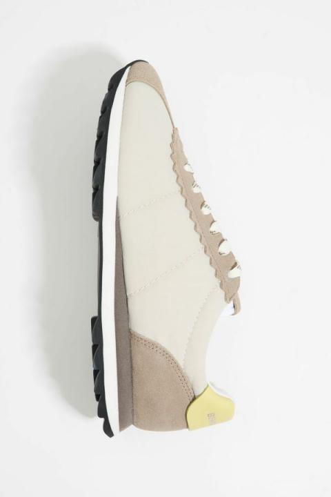 Deportiva retro 13 18 en color gris. Modelo con piezas de serraje combinadas con tejidos técnicos. Empeine festoneado, pespuntes laterales, lengüeta con etiqueta de serraje con logo grabado y parte trasera de piel con logo laminado plateado. Entresuela bicolor y suela con acabado dentado y logo.