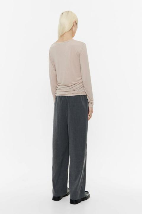 Pantalón de lana fría en color gris. Modelo estilo jogger, pliegues delanteros, cintura elástica y bolsillos laterales.