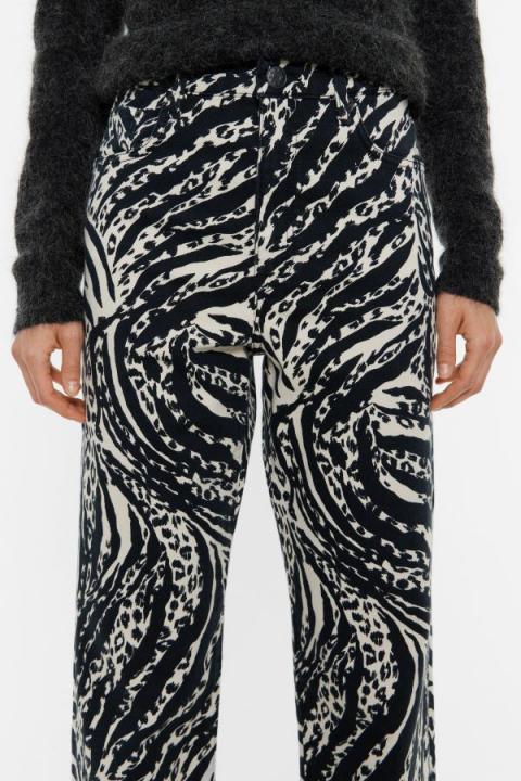 Pantalón vaquero con print Zebra en color marfil. Modelo de corte straight cropped, de tiro alto, con cierre de botón denim frontal y cinco bolsillos. Este modelo contiene 20% Fibras recicladas.