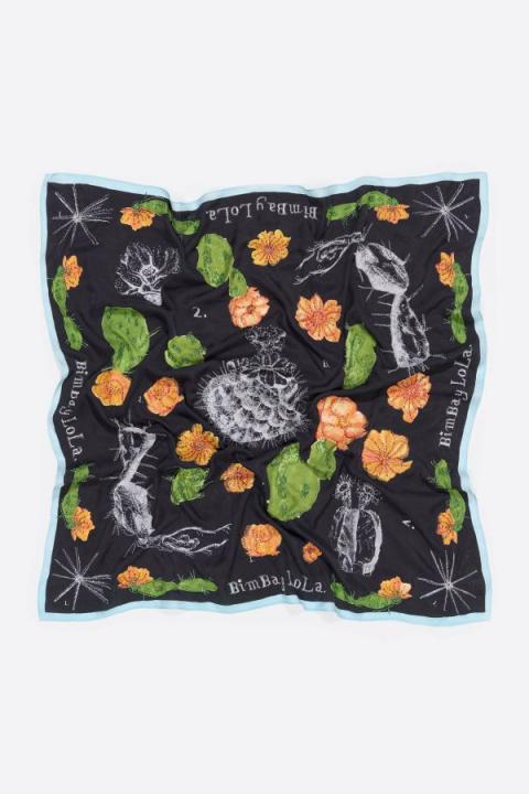 Pañuelo con estampado de cactus y logo con abalorios sobre fondo color negro.