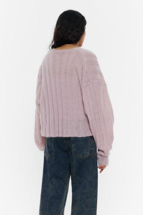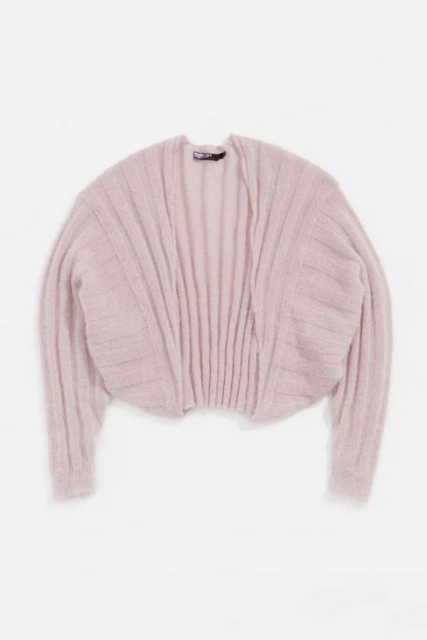 Cárdigan de mohair en color rosa claro. Modelo de corte oversize , escote pronunciado, manga murciélago maxilarga y canalé multidireccional por toda la prenda.