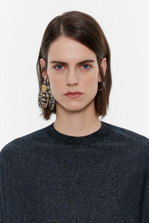 Jersey de lúrex en color azul marino. Modelo de corte recto, con escote barco y manga murciélago caída.